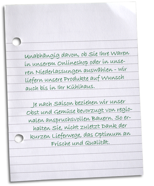 Seit über 50 Jahren stehen wir für überragende Qualität und absolute Zuverlässigkeit im Obst- und Gemüsegroßhandel. Unsere Kunden sind der Facheinzelhandel, Filialbetriebe, Wochenmärkte, die verarbeitende Industrie, Großverbraucher und namhafte Betriebe der Systemgastronomie.